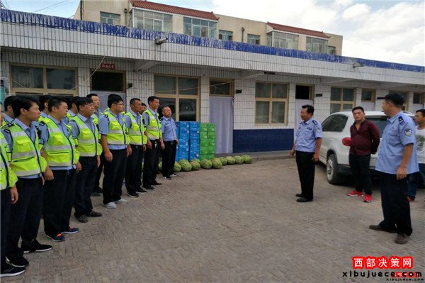 西部決策網(wǎng)訊( 鄒坤 通訊員 崔春月) 時值夏日,天氣持續(xù)高溫,2016年8月10日下午,靖邊縣公安局黨委委員、交警大隊長王世崗、辦公室主任黃瑞峰等一行來到該大隊城區(qū)二中隊慰問在高溫酷熱天氣下堅守崗位的一線民警,深刻表達了大隊黨委對一線民警的關心和關愛,并將防暑降溫物品及時送到了一線民警手中。