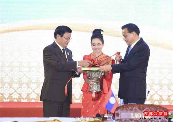 李克強(qiáng)總理7日同東盟10國領(lǐng)導(dǎo)人在老撾萬象共同出席中國—東盟建立對(duì)話關(guān)系25周年紀(jì)念儀式。觀看紀(jì)錄短片、發(fā)布對(duì)話合作事實(shí)與數(shù)據(jù)手冊(cè)后,李克強(qiáng)與東盟主席國老撾總理通倫、中國東盟關(guān)系協(xié)調(diào)國新加坡總理李顯龍?jiān)谂c會(huì)各國領(lǐng)導(dǎo)人見證下一起切蛋糕。