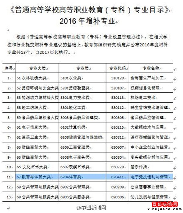 近日,教育部發(fā)布《普通高等學校高等職業(yè)教育(專科)專業(yè)目錄》2016年增補專業(yè),公布了13個新增專業(yè),其中包括“電子競技運動與管理”,屬體育類。新增專業(yè)適用于高等職業(yè)學校,將于2017年實行。