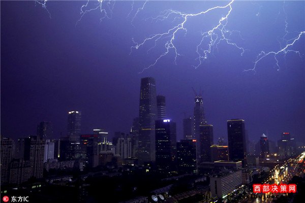 雷雨突如其來光顧北京城區(qū) 閃電劃破天際
