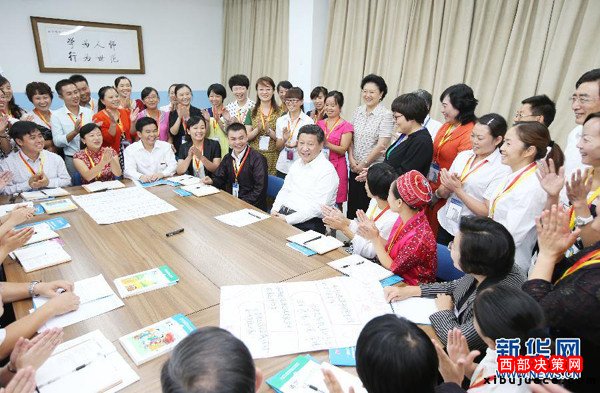 ?。?014年9月9日,習(xí)近平來到北京師范大學(xué)看望教師學(xué)生,向全國廣大教師和教育工作者致以崇高的節(jié)日敬禮和祝賀。這是習(xí)近平同正在北師大參加“中小學(xué)教師國家級(jí)培訓(xùn)計(jì)劃”的貴州小學(xué)骨干語文教師交流。新華社記者姚大偉攝)