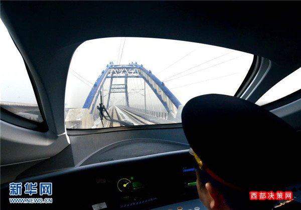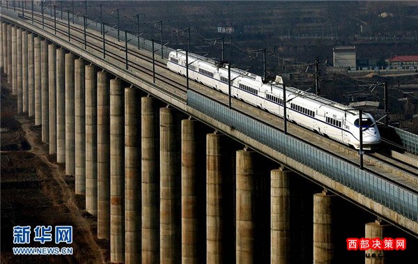 一列試運行的動車組列車從鄭西高鐵三門峽附近的一座特大型橋梁上駛過(2010年1月16日攝)。