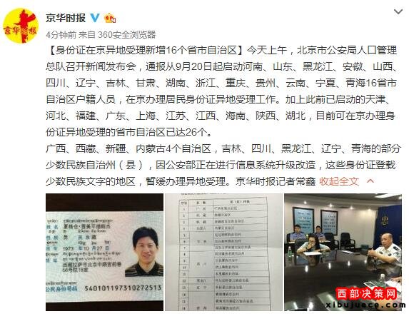 身份證在京異地受理新增16個(gè)省市自治區(qū)