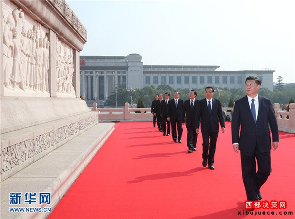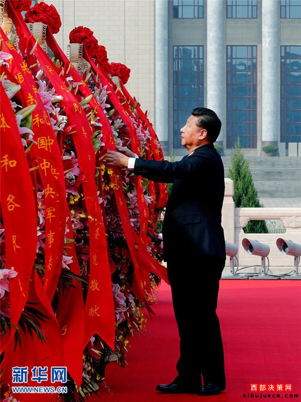 9月30日上午,黨和國家領(lǐng)導(dǎo)人習(xí)近平、李克強(qiáng)、張德江、俞正聲、劉云山、王岐山、張高麗等來到北京天安門廣場,出席烈士紀(jì)念日向人民英雄敬獻(xiàn)花籃儀式。這是習(xí)近平整理花籃上的緞帶。新華社記者鞠鵬攝
