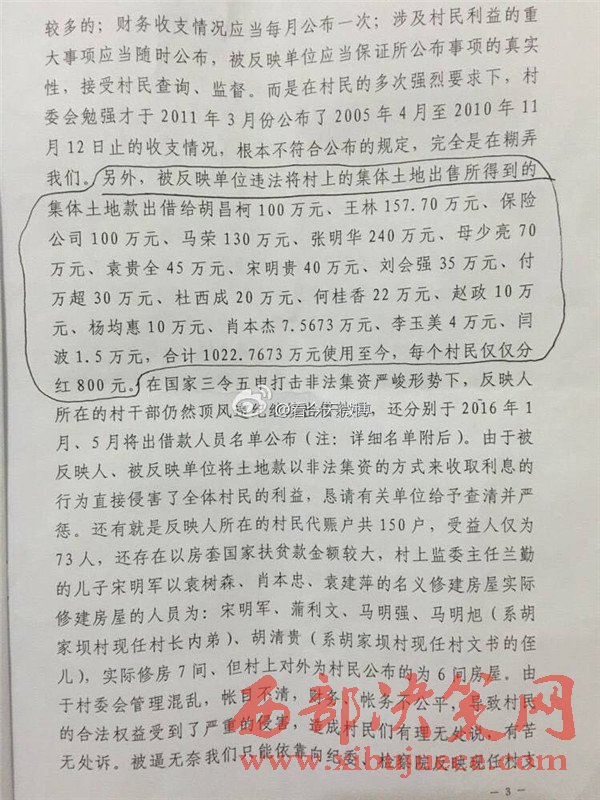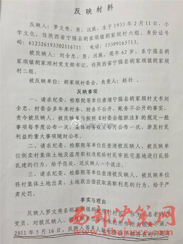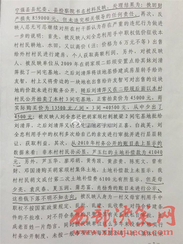 西部決策網訊   近日,有網友微博爆料,陜西省漢中市寧強縣胡家壩鎮(zhèn)胡家壩村,村干部劉全忠利用惠民政策,套取國家大量資金。對于國家扶貧項目,巧立名目、貪污、侵占村民利益。濫用職權違規(guī)審批宅基地,倒賣村集體土地,并將村上千萬余元出借他人賺取利息,且村務不公開、賬務弄虛作假、嚴重違紀行為。