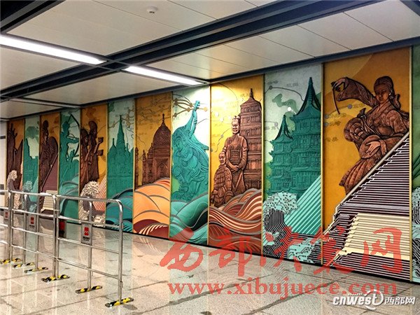 小寨地鐵站的文化墻上,除了有長(zhǎng)安的大雁塔、兵馬俑外,還有行走在絲路上的駱駝、以及絲路使者,既彰顯了長(zhǎng)安的歷史文化又體現(xiàn)了絲路元素。