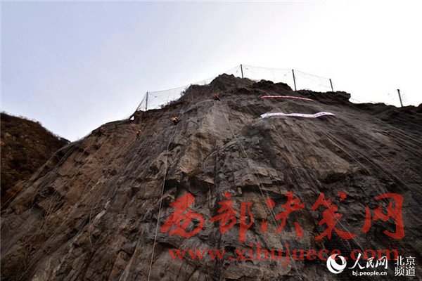 北京大山里的蜘蛛人網(wǎng)住懸崖保行車安全