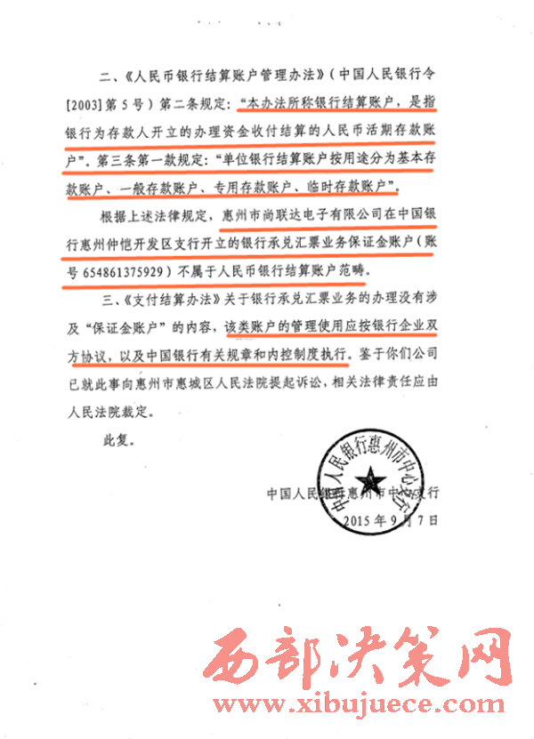 人行惠州分行則認定,涉案保證金賬戶不屬于人民幣銀行結(jié)算賬戶管理范籌,無需經(jīng)當?shù)厝嗣胥y行核準和備案,保證金賬戶的資金劃轉(zhuǎn)、使用在不違反國家法律、法規(guī)的前提下,由銀行和單位協(xié)商,按協(xié)議辦理。