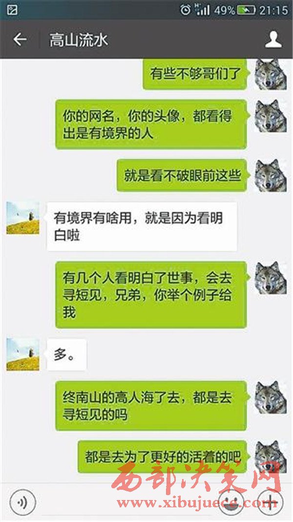 “跳樓算啦”、“堅(jiān)持不了了,死了也好”……11月12日晚,身在陜西的王先生怎么也睡不著,微信里23歲邛崍小伙徐超(化名),不斷表達(dá)著自己的“死意已決”。這讓他變得緊張而擔(dān)心,他不停地通過微信發(fā)去勸說信息,同時(shí)兩次向四川警方報(bào)警,希望小伙能夠放棄輕生的念頭。而其實(shí)兩人并不相識,“只是通過一個(gè)帖子偶然結(jié)識的,甚至不知道他的名字。”王先生說。