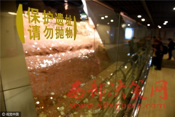 而就在游客身邊的玻璃墻上,赫然寫著“保護(hù)遺址,請(qǐng)勿拋物”8個(gè)大字。