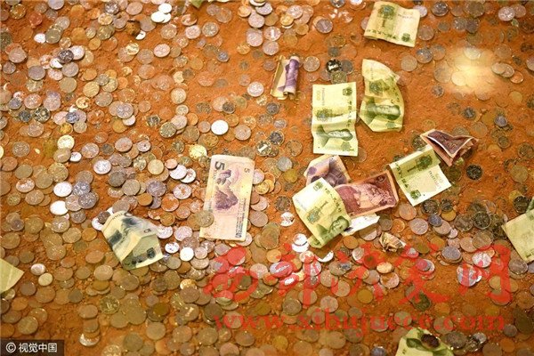在浙江杭州雷峰塔地宮遺址,不少前來參觀的游客都往遺址內(nèi)扔錢。