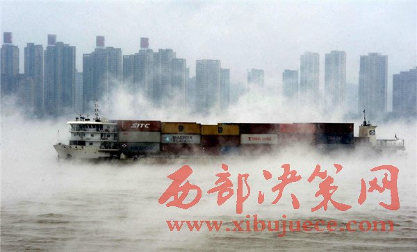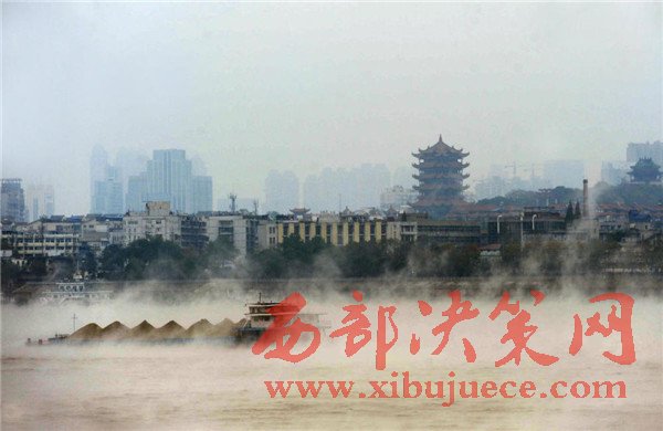 2016年11月23日,湖北武漢,寒潮帶來極速降溫后,由于江水溫度較大氣溫度高出不少,長江江面上出現(xiàn)層層水霧,煙波浩渺,蔚為壯觀,放眼望去,仿佛整個(gè)城市都漂浮在云霧之中。