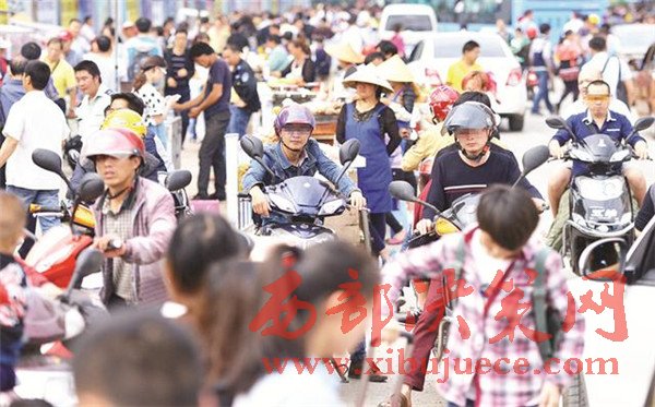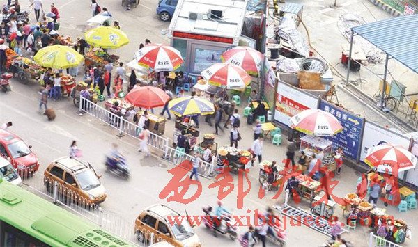 (沒有整治前。進(jìn)入火車站前的道路上,商販的推車構(gòu)成兩條直直的長線。資料圖)