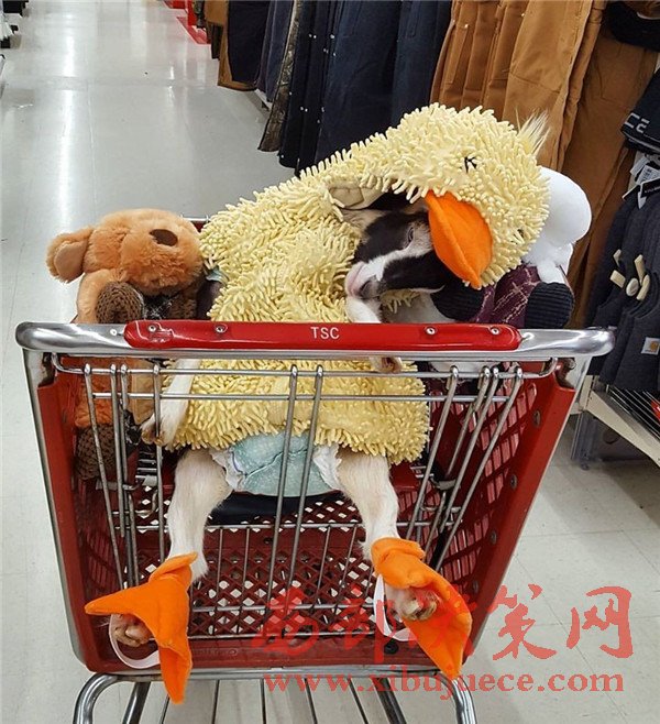 有時(shí)候琳恩出門又不能把Polly一個羊扔在家里的時(shí)候,就會給小家伙套上鴨子服,帶它出去。被打扮成鴨子的小羊在陌生的環(huán)境里也不再害怕,還在購物車?yán)锎蛄藗€小盹。
