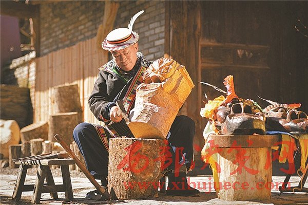 白馬藏族非遺傳承人旭仕修正在雕刻曹蓋頭像。