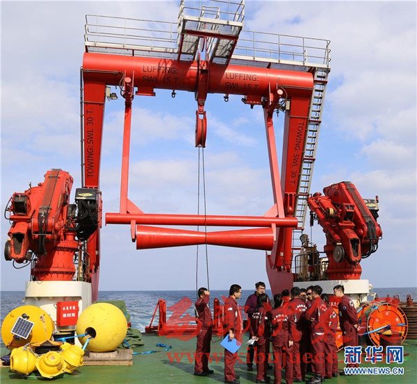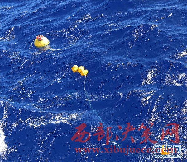 在深海潛標(biāo)回收作業(yè)中,潛標(biāo)主浮體和玻璃浮球浮出水面(11月18日攝)。我國遠(yuǎn)洋綜合考察船“科學(xué)”號正在西太平洋執(zhí)行潛標(biāo)觀測網(wǎng)維護(hù)與升級任務(wù)。截至目前,科考隊(duì)員已獲取了140余件觀測設(shè)備連續(xù)1年的現(xiàn)場數(shù)據(jù),維護(hù)了8套深海潛標(biāo),并重新布放至西太平洋海域。
