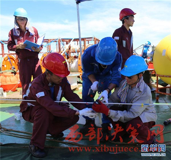 科考隊(duì)員在進(jìn)行深海潛標(biāo)布放和回收作業(yè)培訓(xùn)(11月12日攝)。我國遠(yuǎn)洋綜合考察船“科學(xué)”號正在西太平洋執(zhí)行潛標(biāo)觀測網(wǎng)維護(hù)與升級任務(wù)。截至目前,科考隊(duì)員已獲取了140余件觀測設(shè)備連續(xù)1年的現(xiàn)場數(shù)據(jù),維護(hù)了8套深海潛標(biāo),并重新布放至西太平洋海域。