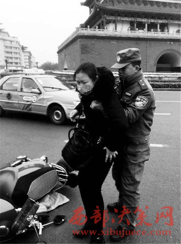 昨天17時10分,碑林區(qū)城市管理局柏樹林中隊執(zhí)法隊員馬奔和張翼在鐘樓開元商城區(qū)域正常開展巡查時,突然看見一名中年女子騎著電動車路過鐘樓十字右拐過程中,被一輛轎車撞了一下,緊接著,騎車的中年女子連人帶車倒在地上,肇事車輛當場逃逸。