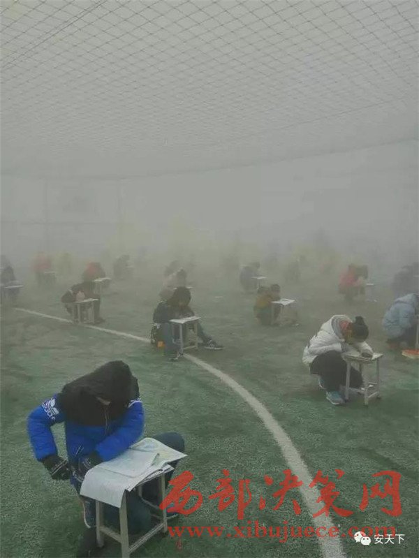 投訴人閆先生給記者發(fā)來(lái)兩張照片,照片顯示,天氣灰蒙蒙的,在一個(gè)露天的足球場(chǎng)上,很多學(xué)生半蹲著趴在凳子上做卷子,由于霧霾太大,第2排后面的學(xué)生身影已經(jīng)很模糊。20日下午3時(shí)50分左右,大河報(bào)記者趕到林州,當(dāng)?shù)氐目諝忪F霾十分嚴(yán)重,能見(jiàn)度只有二三百米。在臨淇鎮(zhèn)一中學(xué)校附近,記者見(jiàn)到了閆先生。他告訴記者,現(xiàn)在學(xué)校已經(jīng)知道記者要來(lái)采訪了,臨時(shí)放假了,考試也取消了。隨后,在校門口,該校八年級(jí)的一名學(xué)生告訴記者,學(xué)校確實(shí)確實(shí)在12月19日考試了,上午考英語(yǔ)和數(shù)學(xué),下午考語(yǔ)文和物理。該學(xué)生告訴記者,八年級(jí)共十個(gè)班,每個(gè)班六七十人,大家都參加了考試,“在操場(chǎng)上考的,搬著凳子在外面”。