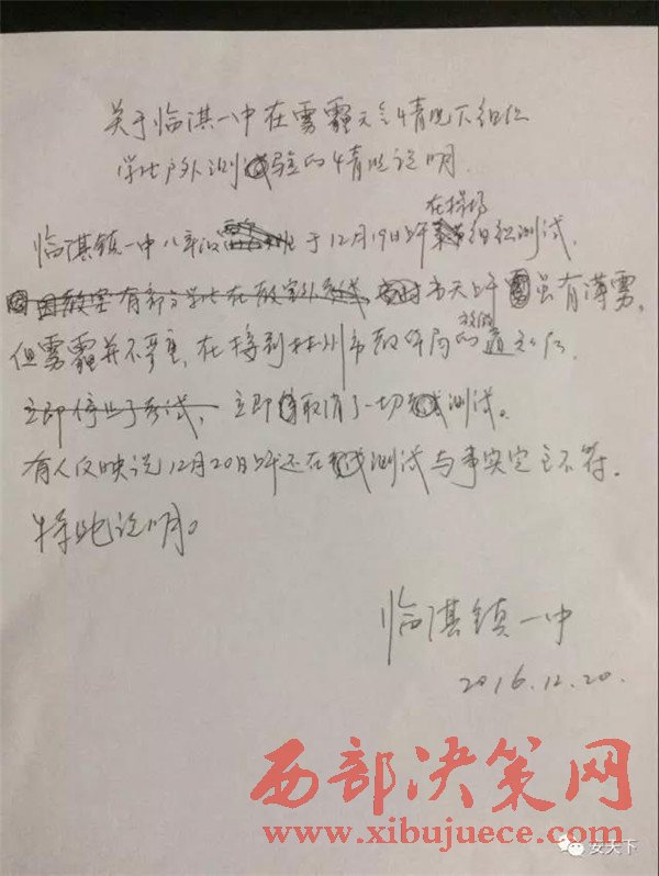 馮校長(zhǎng)出示了一份手寫的情況說(shuō)明:臨淇鎮(zhèn)一中八年級(jí)于12月19日上午在操場(chǎng)組織測(cè)試,當(dāng)天上午雖有薄霧,但霧霾并不嚴(yán)重,在接到林州市教體局的通知后立即取消了一切測(cè)試。有人反映說(shuō)12月20日上午還在測(cè)試,與事實(shí)完全不符。特此說(shuō)明。“為什么有學(xué)生說(shuō)19日下午也考試了?”記者追問(wèn),并說(shuō)出了考試的科目。馮校長(zhǎng)尷尬地笑笑:“組織都組織了,就考完吧。”據(jù)馮校長(zhǎng)介紹,當(dāng)時(shí)并沒(méi)有這么多學(xué)生在操場(chǎng)考試,有一部分學(xué)生在教室考的,在操場(chǎng)上考試的只有480多名學(xué)生。到底是什么樣的考試如此急迫,讓學(xué)生頂著霧霾也要進(jìn)行?馮校長(zhǎng)說(shuō),學(xué)生課講完了,這次考試是一個(gè)摸底測(cè)驗(yàn)考試,也沒(méi)有那么急迫。