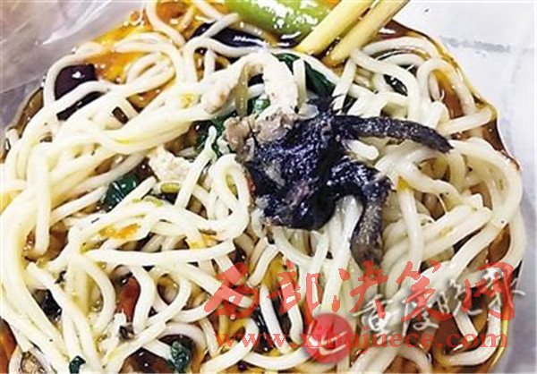 鄒燕介紹,她和同事經(jīng)常去附近張口面館子就餐,也經(jīng)常點(diǎn)這家店的外賣(mài)。19日下午,她通過(guò)美團(tuán)外賣(mài)點(diǎn)了該店酸菜肉絲面和番茄丸子面各一兩,吃酸菜肉絲面時(shí)發(fā)現(xiàn)一塊黑乎乎東西,仔細(xì)一看像老鼠腿,當(dāng)時(shí)就惡心得吃不下去了。
