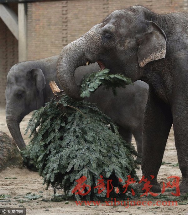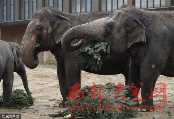 當(dāng)?shù)貢r間2017年1月3日,德國柏林,Zoologischer Garten動物園的大象們食用“圣誕樹”美食大餐。