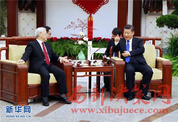 1月12日,中共中央總書(shū)記、國(guó)家主席習(xí)近平在北京人民大會(huì)堂同越共中央總書(shū)記阮富仲舉行會(huì)談。這是會(huì)談后,兩黨總書(shū)記進(jìn)行茶敘。
