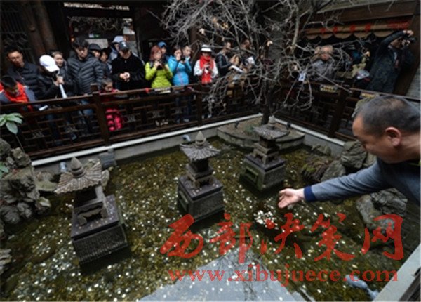 中午時(shí)分,記者又一次仔細(xì)觀察了水池,在游人拋投硬幣時(shí),確實(shí)有一兩條金色的觀賞魚在石縫處游動(dòng)著。在木制欄桿四周,正貼著“禁止倚靠欄桿”、“禁止投幣”等字樣。“春節(jié)游客爆滿,水池是從寬巷子到窄巷子的必經(jīng)之道,加上很多人在拋硬幣,頓時(shí)人滿為患。我們只好打印了幾張?zhí)嵝褟堎N起來。”辦公室工作人員還表示,“等春節(jié)游客潮稍微退卻,天氣回暖,我們就要派人下水打撈這些硬幣,用于景點(diǎn)建設(shè)。”