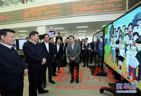 2016年2月19日,中共中央總書(shū)記、國(guó)家主席、中央軍委主席習(xí)近平在北京主持召開(kāi)黨的新聞?shì)浾摴ぷ髯剷?huì),并到中央新聞單位調(diào)研。這是習(xí)近平在新華社觀看新聞信息產(chǎn)品展示。新華社記者蘭紅光攝
