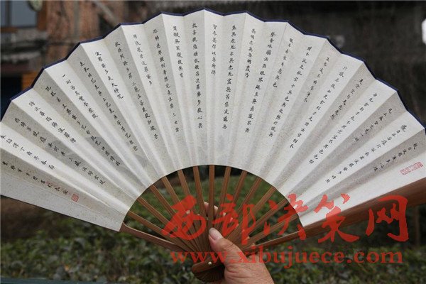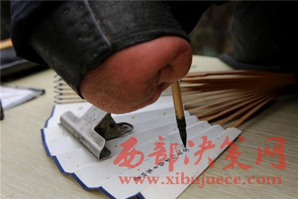 賈維軍的絕活是在折扇上寫蠅頭小楷,賈維軍憋著氣一筆一筆地寫著,字少一點(diǎn)的扇面賈維軍也要花2個(gè)小時(shí)才能完成,要是在扇面上寫《蘭亭序》,賈維軍得花整整一天時(shí)間。每天寫六七個(gè)小時(shí)的蠅頭小楷,賈維軍的眼睛和腿都吃不消了,每天收攤回到出租房眼睛酸疼的流淚,要點(diǎn)眼藥水,靜脈曲張的雙腿到家后也幾乎不能站立。