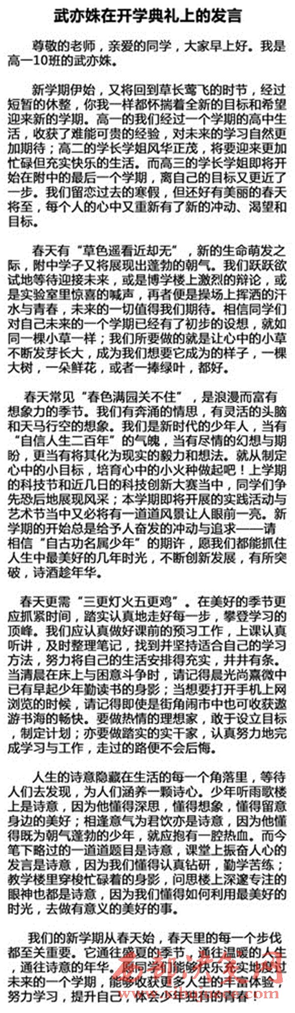 據(jù)復旦附中官網(wǎng),中小學紛紛舉行開學典禮。16日上午,復旦大學附屬中學2016學年第二學期開學典禮隆重舉行。榮獲中央電視臺第二季中國詩詞大會全國總冠軍的文理學院學生武亦姝上臺發(fā)言。