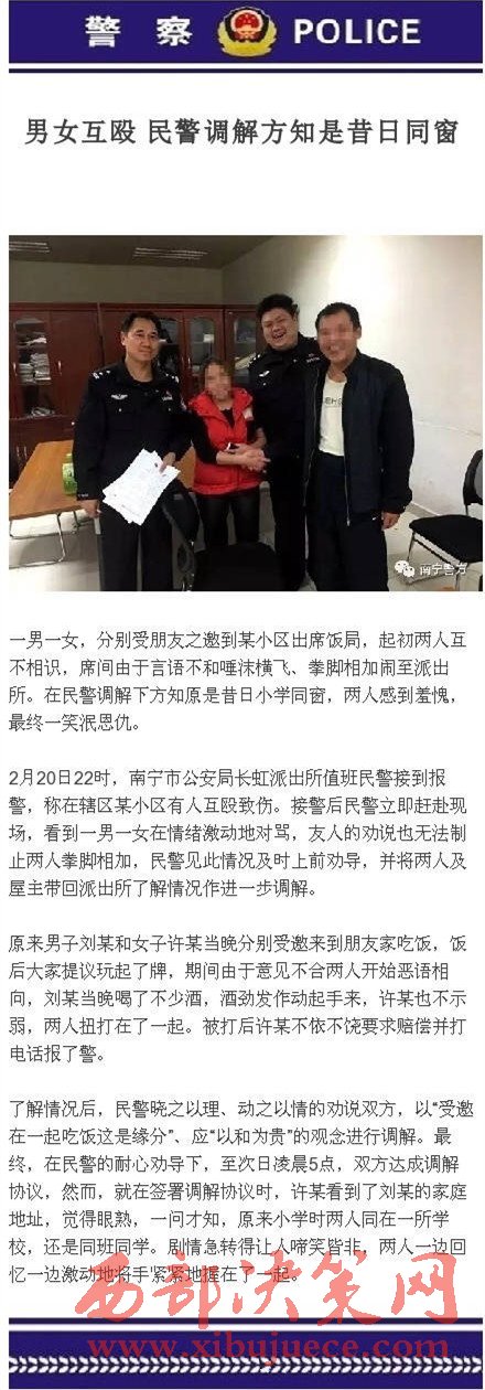 民警調(diào)解完結(jié)后有感而發(fā):“鳳嶺北苑,飲食男女;初,互不相識(shí),受朋友之邀,推樽換盞,好不熱鬧。席間忘乎所以,惡語(yǔ)相向,施拳使腳齊飛,致長(zhǎng)虹受令示警。調(diào)解畫押定論時(shí),此女神情有異,問其故,疑男為昔日同窗。核,真如故,啼笑間,峰回路轉(zhuǎn),40年同窗偶遇,杰男俊女握手言歡!”