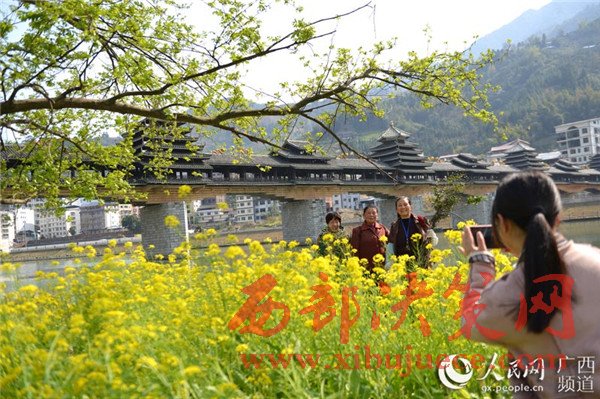 春暖花開時節(jié),廣西龍勝各族自治縣民族風雨橋旁的油菜花競相綻放,風雨橋在油菜花的點綴下美不勝收,形成了一道美麗的春天景致,充滿著濃郁的春天氣息,吸引眾多游客前來觀賞拍照。