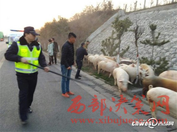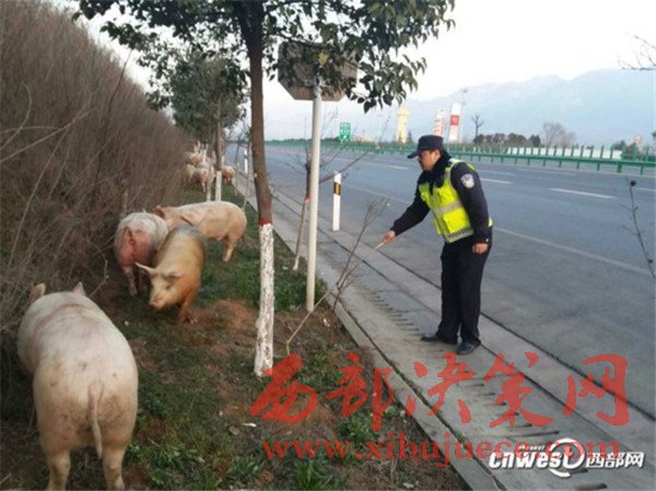 貨車側(cè)翻生豬高速上撒歡,西安交警揮鞭子趕豬回圈。