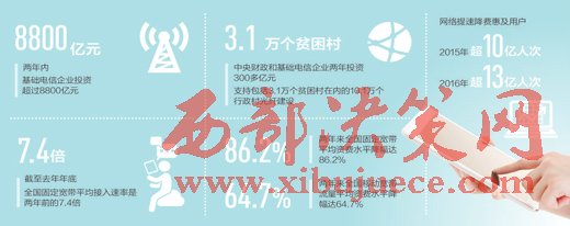 陳肇雄介紹,兩年來,工信部會同有關部委,扎實推進網(wǎng)絡提速降費相關工作落實。圍繞網(wǎng)絡提速,一是深入推進寬帶中國戰(zhàn)略。兩年內(nèi)基礎電信企業(yè)投資超過8800億元,國家發(fā)改委安排中央預算內(nèi)投資10億元,專項建設基金480億元,建成了全球規(guī)模最大的固定光纖和移動4G網(wǎng)絡。二是加快實施電信普遍服務。中央財政和基礎電信企業(yè)兩年投資300多億元,支持包括3.1萬個貧困村在內(nèi)的10.1萬個行政村光纖建設。三是優(yōu)化互聯(lián)網(wǎng)骨干網(wǎng)網(wǎng)絡結(jié)構(gòu)。擴容骨干網(wǎng)網(wǎng)間互聯(lián)帶寬1562G,新增3個互聯(lián)網(wǎng)骨干直聯(lián)點,總數(shù)達到了13個。截至2016年年底,全國固定寬帶平均接入速率達到49M,是兩年前的7.4倍。光纖寬帶用戶占比從34.1%提升到76.6%,進入全球前三位。根據(jù)中國寬帶聯(lián)盟發(fā)布的數(shù)據(jù),我國移動寬帶網(wǎng)絡用戶平均體驗速率已經(jīng)從3G的3.9M提升到目前4G的11.9M。4G用戶已經(jīng)達到7.7億戶,占全球4G用戶的一半以上。
