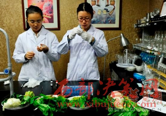 華商報(bào)記者在市場上購買了新鮮的菠菜,白菜,小白菜,油麥菜,青菜,拿到西安營養(yǎng)學(xué)會(huì),專家通過實(shí)驗(yàn)的方法,檢測新鮮蔬菜、冰箱存放48小時(shí)的蔬菜、常溫存放48小時(shí)的蔬菜中亞硝酸鹽含量的變化。