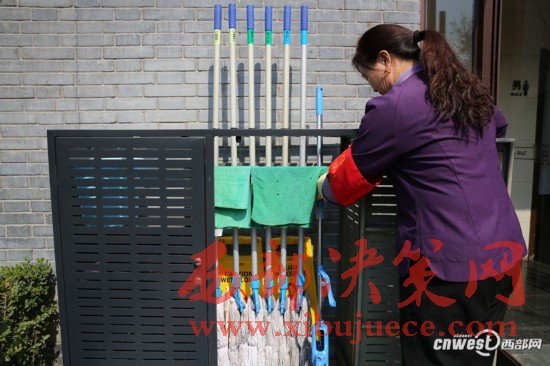 3月8日,西安環(huán)城公園一公廁門(mén)口的拖布柜里整整齊齊放著全套拖布,有男衛(wèi)、女衛(wèi)、門(mén)廳管理房專用的干濕拖布。