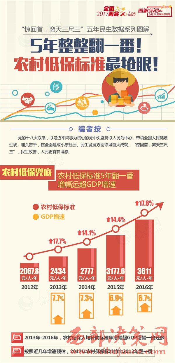 保障低收入群眾基本生活是黨和政府要著力解決好的基礎(chǔ)性工作,是民生保障網(wǎng)需要首先筑牢的“網(wǎng)底”。民政部公布的數(shù)據(jù)更加清晰地說(shuō)明了問(wèn)題:2067.8元,2434元,2777元,3177.6元,3611元……2012年至2016年農(nóng)村低保人均補(bǔ)助標(biāo)準(zhǔn),每年的增幅遠(yuǎn)遠(yuǎn)超過(guò)GDP增速。按照近幾年增速預(yù)估,2017年農(nóng)村低保人均標(biāo)準(zhǔn)將比2012年翻一番。