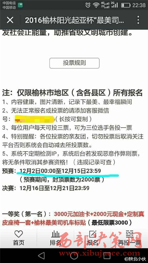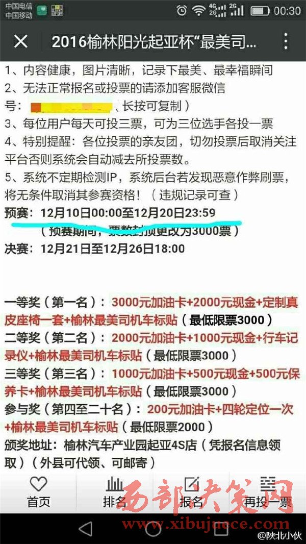 2016年12月初,榆林陽光汽貿(mào)通過某公眾號發(fā)起2016榆林陽光起亞杯“最美司機”評選活動,活動設(shè)置了豐厚了獎品作為獎勵。并組織全民參與評選活動的投票行為。至此,在榆林眾多市民的朋友圈都發(fā)起了轉(zhuǎn)發(fā)拉票行為。然而,此次拉票行為卻不斷變更投票時間和決賽時間。近日,某公眾號發(fā)布信息,聲稱陽光汽貿(mào)組織的“最美司機”活動取消,并給予相應(yīng)的票數(shù)補償。此行為卻引起眾多市民的質(zhì)疑,認(rèn)為陽光汽貿(mào)是在“消遣”參與投票的近萬名市民,從而變相成廣告推銷行為。究竟陽光汽貿(mào)是心疼評選活動的獎品發(fā)放,還是一種涉嫌商業(yè)的欺詐行為,請@榆林工商 ,根據(jù)《消費者權(quán)益保護(hù)法》予以重查重處。