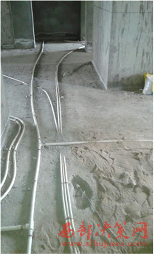 記者跟隨馬某某來(lái)到7層其新房。新房里,客廳、臥室、廚衛(wèi)地面上,白色管道到處穿行,一片狼藉。馬某某指著客廳靠中心的一處地方告訴記者: