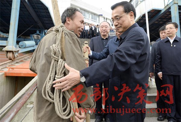 2014年4月27日,李克強在萬州港碼頭與重慶的“棒棒”交流。