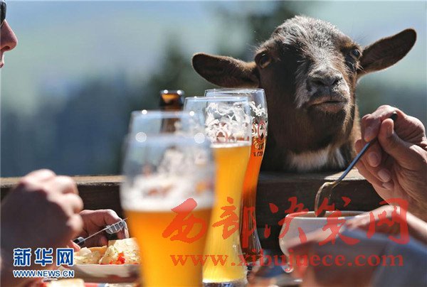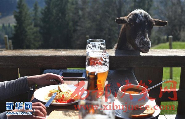 3月27日,在德國(guó)南部塞格附近的一家戶外餐館,一只山羊向正在用餐的客人討要食物。