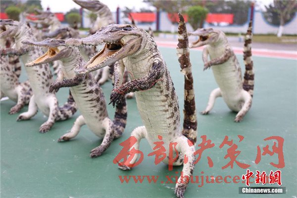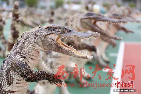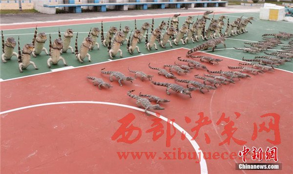 其中鱷魚標(biāo)本32件為站姿,45件為爬行姿態(tài),最大的標(biāo)本長(zhǎng)度近2米。