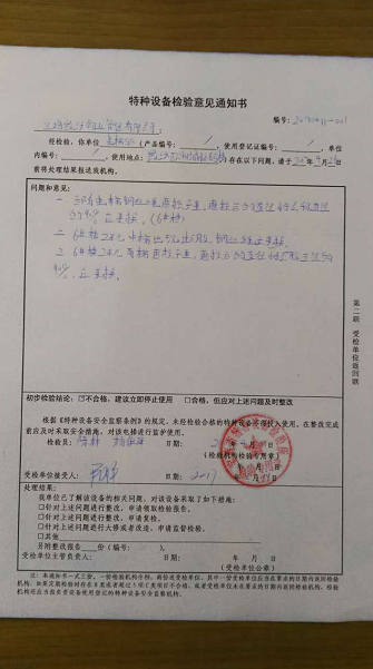經(jīng)過(guò)特檢所現(xiàn)場(chǎng)檢驗(yàn),發(fā)現(xiàn)三部電梯鋼絲繩磨損嚴(yán)重,6號(hào)樓2單元中梯、北梯鋼絲均出現(xiàn)斷股,現(xiàn)場(chǎng)建議更換鋼絲繩,后出具特種設(shè)備檢驗(yàn)意見(jiàn)通知書(shū),對(duì)于檢查出的問(wèn)題要求立即停止使用。