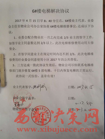 最新進(jìn)展:4月15日,業(yè)主委員會(huì)和凱躍物業(yè)達(dá)成維修協(xié)議,業(yè)委會(huì)配合物業(yè)在一月之內(nèi)完成2/3 業(yè)主的簽字工作,電梯維修費(fèi)使用大修資金。如果在規(guī)定時(shí)間內(nèi)達(dá)不到2/3業(yè)主簽字,則使用小區(qū)2017年的公共營(yíng)收。三方協(xié)議達(dá)成后,由凱躍物業(yè)盡快聯(lián)系電梯維修公司,十日內(nèi)恢復(fù)電梯的正常運(yùn)行。