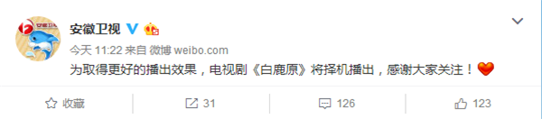 很多守在電視機前準(zhǔn)備看《白鹿原》的觀眾都撲空了,江蘇衛(wèi)視和安徽衛(wèi)視原計劃播放第2集的時間卻各自播放了其他內(nèi)容,但兩方都未對《白鹿原》停播作出解釋。就在今日,兩家衛(wèi)視都官方發(fā)表聲明表示,“為取得更好的播出效果,電視劇《白鹿原》將擇機播出,感謝大家關(guān)注!”