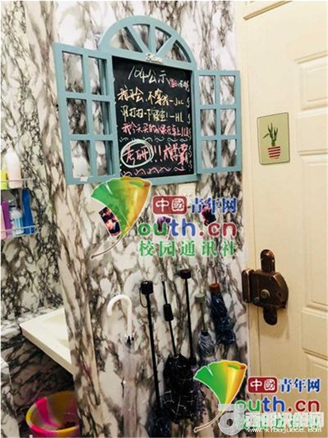 記者了解到,華麗變身后的宿舍,除了效果讓人驚艷不已外,還有許多小細節(jié)同樣讓人覺得很暖心。在門口處有一個小黑板,上面寫著室友的留言和一些鼓勵的話語;進門的地方專門騰出一塊空間,放雨傘、鑰匙等一些物品。