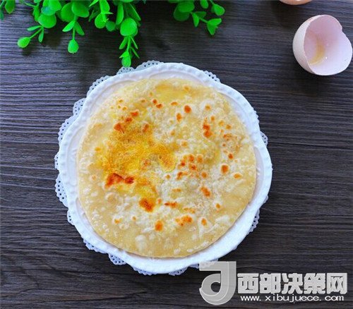 7.平底鍋放少許底油,開始烙餅。如果餅搟的薄,那么很快就會(huì)起大泡,這時(shí)把泡用筷子挑開,灌入蛋液。
