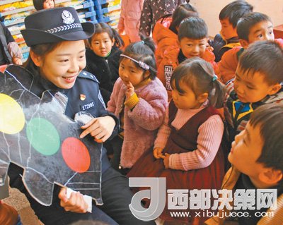 圖為1月15日,派出所民警在下浦幼兒園教小朋友認(rèn)識“紅綠燈”。