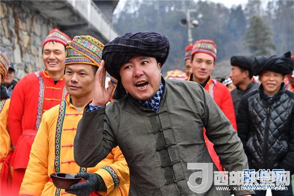 2月4日,在湖南省湘西土家族苗族自治州花垣縣十八洞村,新郎的親友在攔門時(shí)對苗歌。